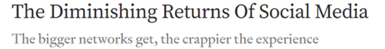 Large networks that were built off of the rewarding experience of connection and community begin to lose their luster, as the Transactional nature of the platforms become more and more front-facing.